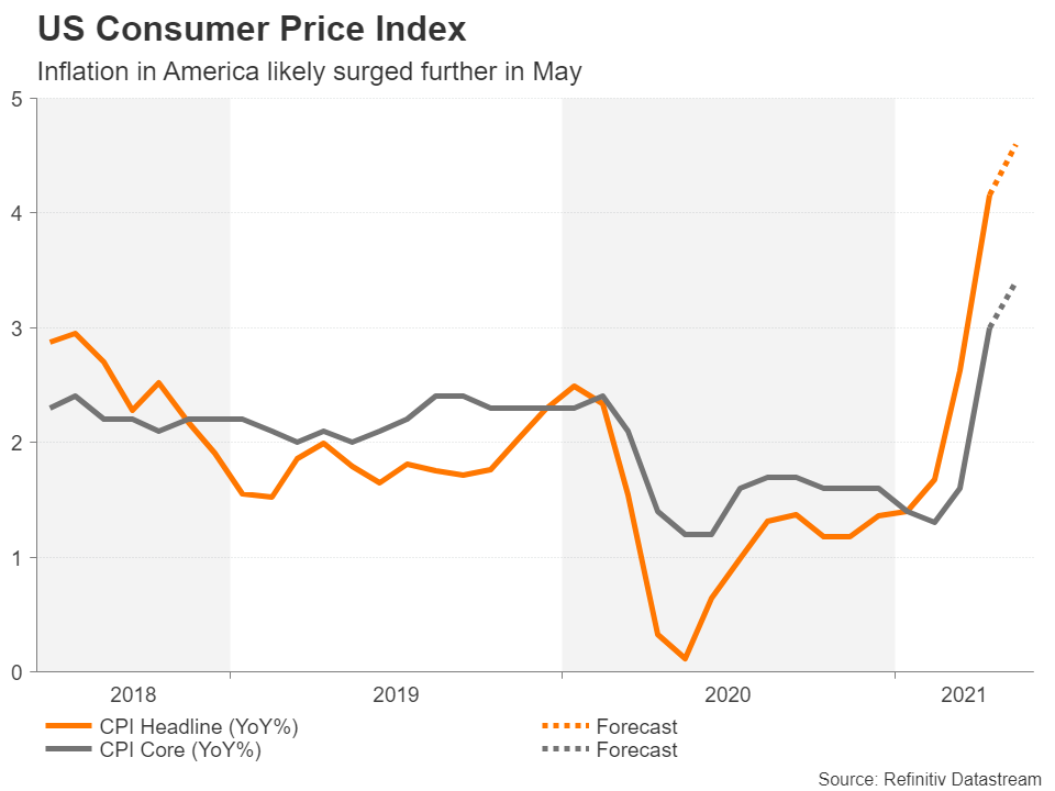 Dual reaction to the US CPI data release later? The estimate for US CPI in May is for the annual reading to tick higher from +4.2% y/y in April to +4.7% y/y. Meanwhile, the core reading is estimated to climb from +3.0% y/y in April to +3.5% in May.